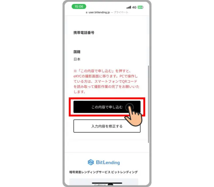 【この内容で申し込む】→【入金アドレスを確認する】をタップします。