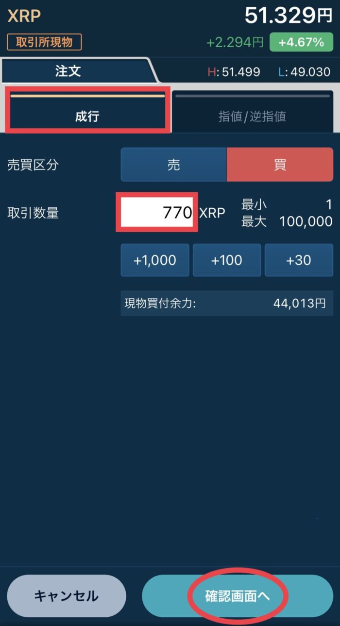 【成行】を選択し、【取引数量】に購入したいビットコインの数量を入力、【確認画面へ】をタップします。